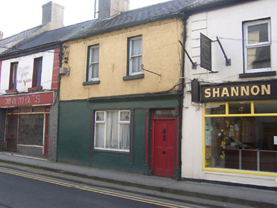 Terraced two-bay two-storey house, c.1800, with traditional shop front inserted to ground floor c.1900. Renovated c.1960. Pitched artificial slate roof with projecting eaves course and rendered chimneystack shared with building to the east. Ruled-and-line rendered walls to the ground floor with roughcast rendered finish above. Square-headed window openings with cut stone sills and one-over-one timber sliding sash windows to first floor and replacement timber casement window to ground floor (shop window) window opening. Timber shopfront with timber pilasters supporting timber fascia board with cornice above. Square-headed doorcase with timber panelled door with overlight above. Road-fronted.
