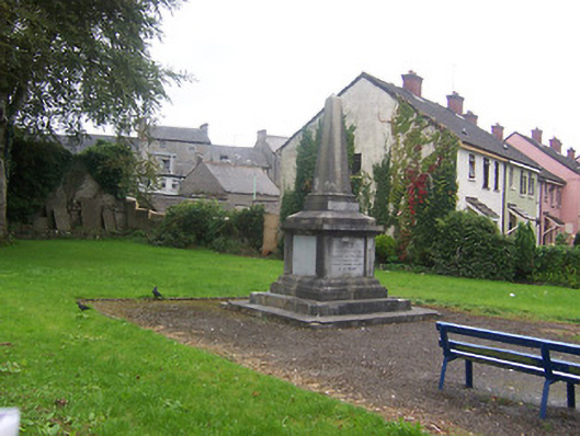 Freestanding obelisk-topped cut-limestone monument, dated 1985, on a square plan on limestone-clad stepped base. Set in relandscaped grounds.
