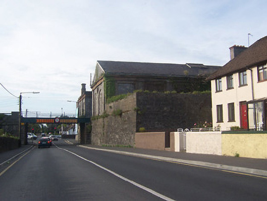 This engine shed is part of the Athlone West Station and was built to designs by J. S Mulvany (1813-70) for the Midland and Great Western Railway Company. This building is not merely a functional structure but has a consciously heroic architectural quality achieved through its scale and robust detailing. The contrast between the crisp snecked limestone and the brick and terracotta detailing creates and attractive appearance. Forms an interesting pair with the goods shed (15004146) to the north.