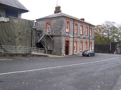 Detached five-bay two-storey former guard house, built c.1870. Now in use as offices. Hipped natural slate roof with plain ashlar eaves cornice and rendered chimneystacks to either end of roof ridge. Built of dressed limestone with rusticated limestone quoins to corners, a projecting ashlar string course at first floor level and red brick dressings to openings. Segmental-headed window openings with cut stone sills and six-over-six pane timber sliding sash windows. Segmental-headed doorcase to western-most bay with glazed timber doors with six-pane overlight above. Modern fire escape to west end elevation. Located to east end of Custume Barrack complex.