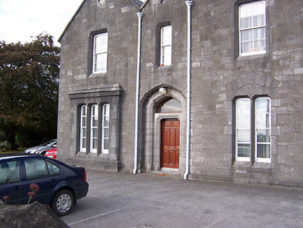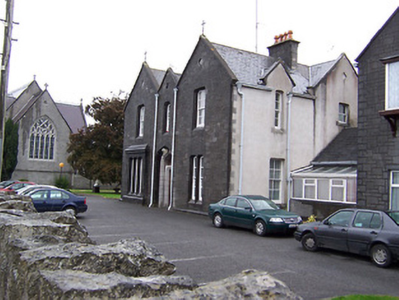 Semi-detached three-bay two-storey presbytery building, built c.1860 with three-bay two-storey extension and single-storey connecting corridor to east, built in 1987. Pitched natural slate roofs with dressed limestone chimneystacks, raised limestone verges and cast-iron finials to gables. Cast-iron rainwater goods. Constructed of dressed limestone over ashlar plinth with ashlar limestone detailing, inscribed quatrefoils to gables and flush ashlar quoins to corners. Square-headed window openings with splayed ashlar reveals with timber sliding sash windows, paired and in groups of three to ground floor, single above. Central segmental-headed doorcase with recessed ashlar surrounds, timber panelled door with segmental-headed overlight above. Set back from road in own grounds and bounded by roughly crossed limestone rubble wall with crenellated coping. Located to the east of St. Mary's Church.