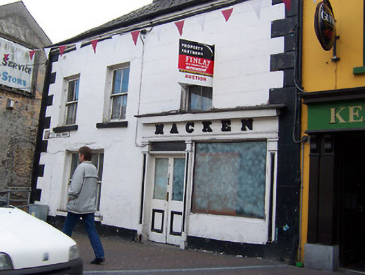 End-of-terrace three-bay two-storey house, c.1800, renovated c.1900 with traditional timber shopfront insert to west end. Steeply pitched slate roof with projecting eaves course, rendered chimneystack to east end and shared rendered chimneystack to west. Ruled-and-lined rendered walls over rubble masonry with slight base batter and raised quoins to corners. Partially slate-hung to rear (south). Square-headed window openings with two-over-two pane timber sliding sash windows, paired window to east end of ground floor. Traditional timber shopfront to west end with fixed pane display window and timber glazed double doors, flanked by timber pilasters (with Doric capitals) with timber fascia over. Timber counter and fittings to interior. Road-fronted.