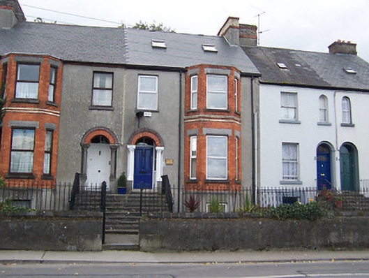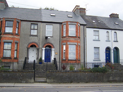 Terraced two-bay two-storey over basement house, built c.1890, with full-height canted bay window to north end. One of a pair with the building to south. Pitched slate roof with projecting brick eaves course and a rendered brick chimneystack with brick detailing to north end. Modern rooflights. Roughcast-rendered walls, red brick to canted bay with yellow brick string courses. Square-headed window openings with cut stone sills and replacement windows, limestone lintels to openings on canted bay. Square-headed doorcase with timber door, glazed surrounds and simple overlight inset in round-headed arch with moulded brick archivolt on cut limestone columns with carved limestone foliate capitals above. Flight of (shared) limestone steps flanked by metal railings to entrance front. Set back from road in own grounds with rendered boundary wall with cut stone coping and railings over to front.