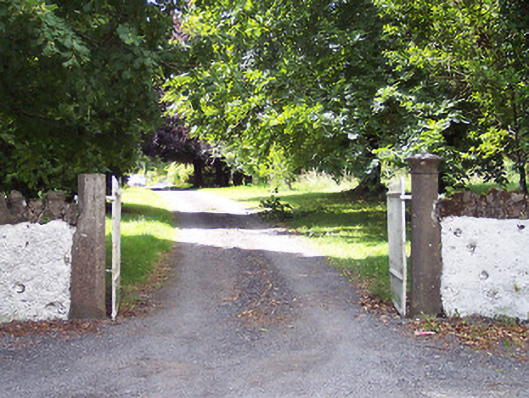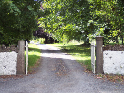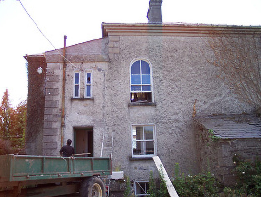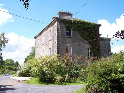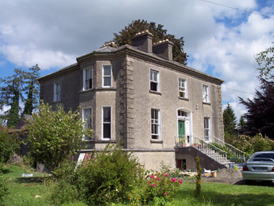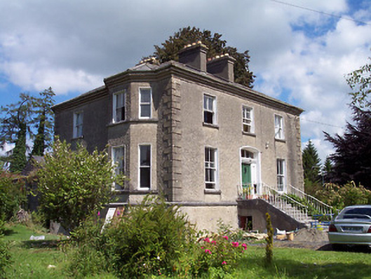 Detached three-bay two-storey over part raised basement Church of Ireland rectory, built 1847, on an L-shaped plan. Hipped slate roof on an L-shaped plan with ridge tiles, paired rendered central chimney stacks having corbelled stringcourses below capping supporting terracotta or yellow terracotta pots, and cast-iron rainwater goods on rendered stepped eaves. Roughcast walls on cut-limestone chamfered cushion course on roughcast base with rendered quoins to corners. Camber-headed central door opening approached by flight of ten steps between wrought iron railings with moulded rendered surround framing timber panelled door having oversailing overlight. Square-headed window openings with cut-limestone sills, and concealed dressings framing two-over-two timber sash windows. Set in landscaped grounds with cut-limestone octagonal piers to perimeter having polygonal capping supporting wrought iron double gates.