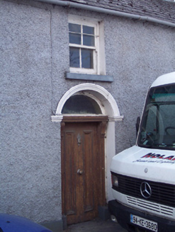 Detached three-bay two-storey house, built c.1820. Pitched artificial slate roof with cast-iron rainwater goods and with a brick chimneystack to either gable end. Roughcast rendered finish to the walls. Square-headed window openings with two-over-two pane timber sliding sash windows and cut one sills. Round-headed doorcase to the centre with original recessed panelled timber door with plain fanlight and with a rendered hoodmoulding over. Road fronted with evidence of recently demolished return to the rear (west).