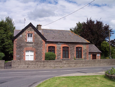 An appealing late nineteenth-century school house having an attached school master’s residence. It retains much of its original character with a sympathetic extension to the north site and well-maintained gardens. The school is distinguished by the contrast between the limestone walls and red brick surrounds which creates a pleasing visual contrast. This structure is of social importance due to its role as a Church of Ireland primary school since the later part of the nineteenth century. Prominently positioned on an elevated site to the west of the village, the school forms an attractive feature in the streetscape.