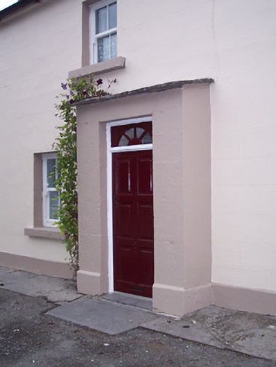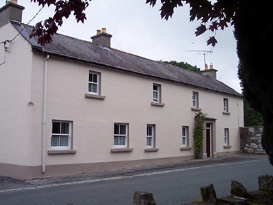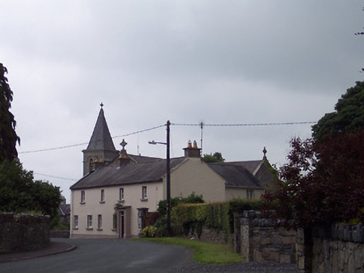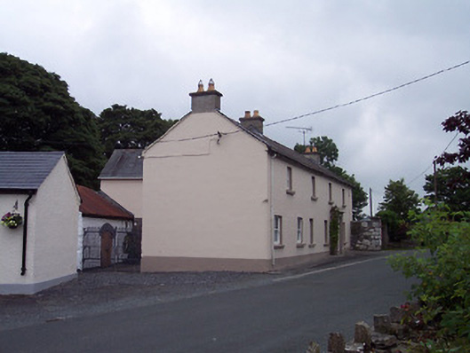 Detached six-bay two-storey house, built c.1820, with projecting single-bay single-storey porch to south end of main façade (west). Pitched natural slate roof with projecting eaves course, raised verges, rendered chimneystacks and cast-iron rainwater goods. Ruled-and-line rendered walls over smooth rendered chamfered plinth. Rounded/chamfered corner to ground floor at northeast end. Square-headed openings with cut stone sills and replacement sliding sash-style uPVC windows. Square-headed doorcase to projecting porch with timber panelled door and overlight above. Rubble limestone wall to north, set perpendicular to main house, with a wrought-iron gate leading to a small rear courtyard enclosed by rear return to the main house (south) and a whitewashed single-storey limestone outbuilding with corrugated tin roof (east). Road-fronted a short distance to the south of Multyfarnham Village adjacent to St. Nicholas Church