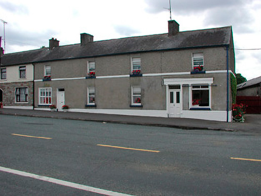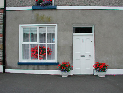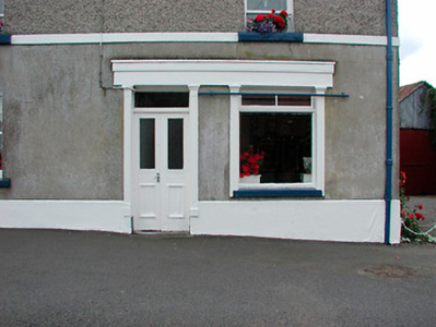 End-of-terrace four-bay two-storey house, built c.1820, incorporating early shopfronts to either end (east and west). Pitched natural slate roof with rendered chimneystacks and cast-iron rain water goods. Smooth rendered walls to ground floor with pebble dash above, separated by rendered string course. Rendered plinth to base. Square-headed window openings with one-over-one pane timber sliding sash windows and cut stone sills. Square-headed doorcases with overlight to both shopfronts, early timber panelled door to east and double-leaf timber door with glazed panels to western shopfront. Western shopfront has timber fascia with moulded cornice supported on moulded timber pilasters with fixed-pane timber display window and casement window above. Simple shopfront to east with multi-paned timber casement window with simple render surround. Road fronted with outbuildings to rear.