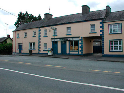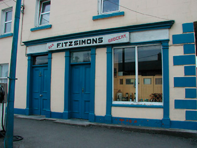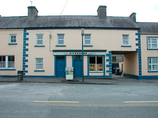 Terraced four-bay two-storey house, built c.1800, incorporating shopfront (c.1880) and integral carriage arch. Pitched natural slate roof with rendered chimneystacks and cast-iron gutters. Ruled-and-lined render to walls with raised quoins to corners, projecting rendered eaves course and rendered plinth to base. Square-headed openings with cut stone sills, replacement uPVC windows to first floor and a single one-over-one pane timber sliding sash window to ground floor. Two square-headed door openings to shopfront with timber panelled double-doors and plain overlights above. Timber shopfront with fluted Doric pilasters, fixed-pane timber display windows and timber fascia over with moulded cornice. Road-fronted with disused petrol pub and garage sign to front. Located close to centre of Clonmellon.