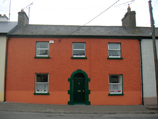 Terraced three-bay two-storey house, built c.1810. One of a terrace of four. Pitched artificial slate roof with rendered chimneystacks to party walls and uPVC rainwater goods. Pebbledashed walls over rendered plinth course. Square-headed window openings having stone sills and uPVC windows. Round-headed door opening with cut stone block-and-start surround, modern timber panelled door and plain glass fanlight over. Road-fronted to west end of Ballynacarrigy.