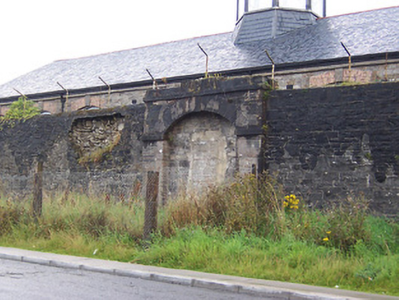 Boundary wall surrounding Columb barracks (15310007 to 1531019), built c.1814, having a number of former integral carriage arch entrances to the north on Ashe Road. Constructed of coursed rubble limestone. Wall now collapsing in places with wire security fence over. Pistol loop hole openings to wall, particularly towards the east end of Ashe Road elevation. Entrances to Ash Road constructed in dressed limestone, each having a segmental-headed carriage arch, dressed limestone flanking piers and a dressed limestone parapet over. Entrances now mostly blocked-up. Located to the west of Mullingar.