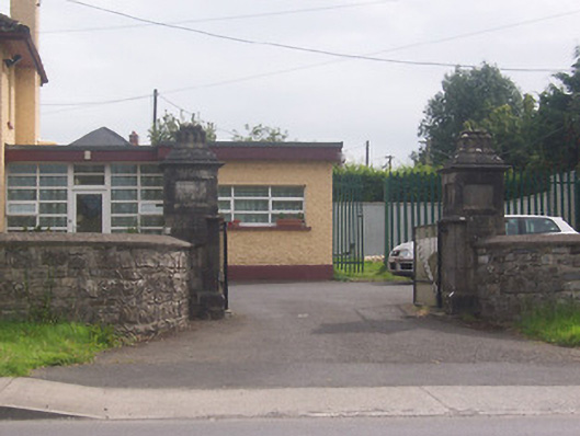 Gateway, erected c.1850, comprising a pair of ashlar limestone gate piers (on square-plan) having recessed square-headed panels and moulded capstones with lingas, mortar shells or a stone blacmange motifs over. Now forms the entrance to a modern building and with modern gates. Located on the south side of the Delvin Road and to the northeast of Mullingar.