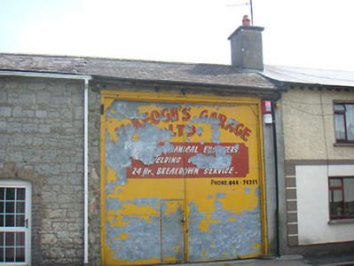 An appealing pair of well-designed early nineteenth-century houses, which retain their early charm and form. These buildings are well-constructed using rubble limestone, which creates an appealing visual contrast with the brick dressings to the openings and the brick quoins to the corners. The building to the east has been compromised by the replacement fittings to the openings and this takes away from the visual expression of this building. The building to the west end, however, retains its early cast-iron windows, which are now a very rare survival. The scale and form of the building to the east end now in use as a garage, suggests that it was originally a house and that this was originally a terrace of three similar buildings. The form of these buildings hints that they were built under the patronage of a local landlord. Therefore, it is likely that these structures were built by the stone masons Thomas and William Keegan, who built much of Killucan under the patronage of Lord Longford during the early part of the nineteenth century. These picturesque small-scale houses are an important component of the historic streetscape of Killucan and are integral elements of the built heritage of the local area.