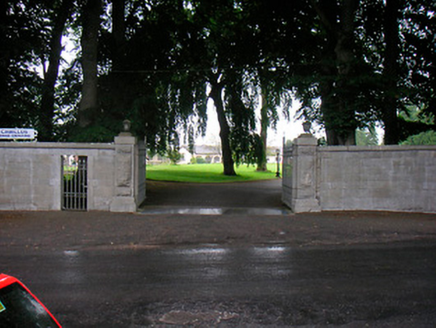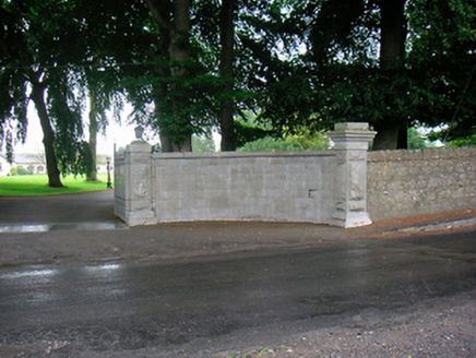 Gateway serving to Riverstown House (15312021), erected c.1880, comprising a pair of ashlar gate piers (on square-plan with moulded ashlar capstones over and having rock-faced panels to shaft), supporting a pair of cast-iron double gates with decorative finials. Main gateway flanked to either side (north and south) by sections of ashlar limestone quadrant walling (on curved plan with moulded coping over) and terminated by further ashlar gate piers with rock-faced panels and with moulded capstones over. Square-headed pedestrian entrance to the south quadrant wall having raised ashlar limestone block-and-start surround and a wrought-iron gate. Similar pedestrian entrance to the north quadrant wall now blocked. Rubble limestone boundary walls run away to the north and the south. Located to the northeast of the Riverstown House and to the southwest of Killucan/Rathwire.