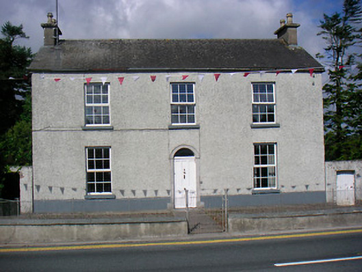 Detached three-bay two-storey house, built c.1820. Pitched natural slate roof with cast-iron rainwater goods and with a rendered chimneystack to either gable end (north and south) having terracotta pots over. Pebbledashed walls over projecting smooth rendered plinth course. Square-headed window openings with cut stone sills and replacement windows. Central round-headed door opening with cut stone surround, plain glass fanlight and a timber panelled door. Flanking single-storey walls to either gable end of house (north and south) with square-headed pedestrian entrances giving access to the rear. Site slightly back from road with low rendered wall with simple cast-iron gates and railings to the road frontage (east). Located to the centre of Glassan village.