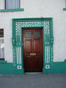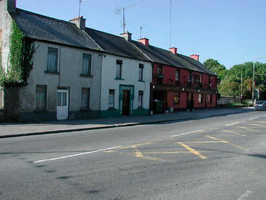 Terraced two-bay two-storey house, built c.1906. One of a pair with the building adjacent to the east (not in survey). Pitched natural slate roof with cast-iron rainwater goods and a rendered chimneystack to either end (east and west). Roughcast rendered walls over smooth rendered plinth. Square-headed window openings, irregularly spaced, with cut stone sills and replacement windows. Square-headed doorcase to the centre of the front façade (north) having decorative surround with raised pilasters, moulded hoodmoulding over with decorative label stops and with decorative rendered panels with inscriptions ‘Church Street’ and ‘1906’. Road-fronted to the west end of Moate.