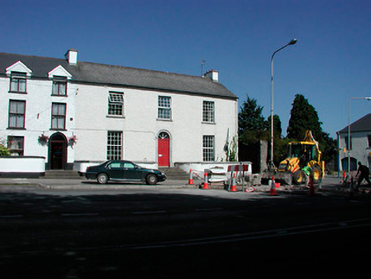 End-of-terrace three-bay two-storey over basement house, built c.1820. Pitched artificial slate roof with rendered chimneystacks to either gable end (east and west). Roughcast rendered walls having square-headed window openings with cut stone sills and replacement windows. Central round-headed doorway with moulded architraved surround having projecting keystone detail over. Timber panelled door having a replacement fanlight over. Flight of five stone steps to the entrance front. Cut stone boundary wall to front (south) having stone coping over. Road-fronted to the centre of Moate.