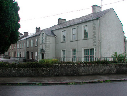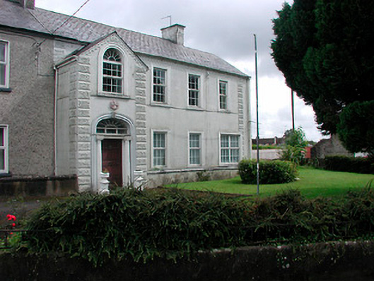 End-of-terrace four-bay two-storey house, built c.1810 and altered c.1880, having a projecting gable-fronted single-bay two-storey section to the north end of the front façade (west). Now in use as a charity health centre. Pitched slate roof having two decorated rendered chimneystacks and cast-iron rainwater goods. Ruled-and-line rendered walls with decorative render detail to the eaves and having vermiculated block quoins to the corners of the main part of the building and to the projecting bay. Square-headed window openings with cut stone sills, moulded surrounds and replacement windows. Paired square-headed window opening to the south end of the front façade at ground floor level. Round-headed window opening to the projecting bay at first floor level having a cast-iron petal fanlight to head. Segmental-headed doorcase to the front face of projecting bay (west) having moulded surround with vermiculated keystone over, a pair of fluted Doric columns supporting a fluted lintel over and a timber panelled door with a petal fanlight above. Plaque of St. John’s Ambulance over door. Located to the east side of the Newtown Suburb to the northeast side of Moate.