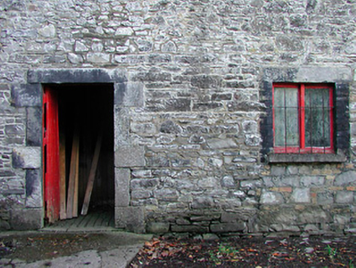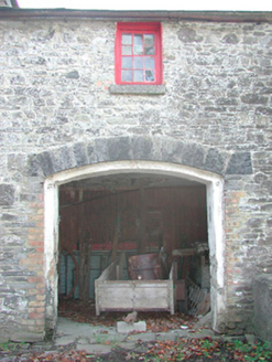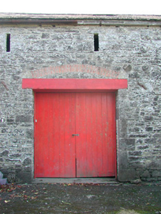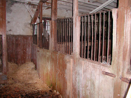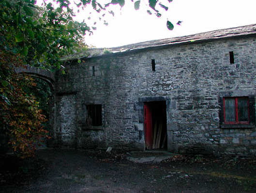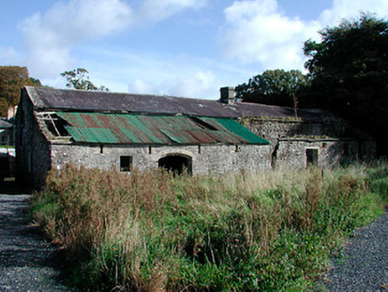 Detached five-bay two-storey stable/outbuilding range, built c.1800, having single-storey sheds with lean-to roof to south side. Pitched natural slate roof with raised cut stone verges, a single ashlar limestone chimneystack and cast-iron rainwater goods. Constructed of rubble limestone, probably originally rendered. Square-headed window openings having brick dressings, a number having dressed limestone lintels and cut stone sills. Timber casement windows with wrought-iron security bars to ground floor openings and loop hole openings to first floor. Single six-over-six pane timber sliding sash window to centre of first floor on north elevation. Square-headed doorcase with dressed limestone block-and-start surrounds having timber sheeted door. Segmental-headed carriage arch to centre with dressed limestone voussoirs over, square-headed carriage arch to west end having brick dressings and timber sheeted double doors. Access is gained to the stable yard from the east through a dressed limestone segmental-headed arch. Remains of walled gardens to the rear. Located to the south of Mornington House (15400709).