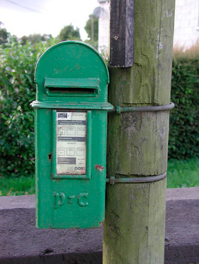 Post-mounted cast-iron post box, erected c.1940, with raised 'P&T' cipher in Gaelic/Celtic Revival script above letter slot and curved top. Attached to telegraph pole adjacent to Kilcar junction.