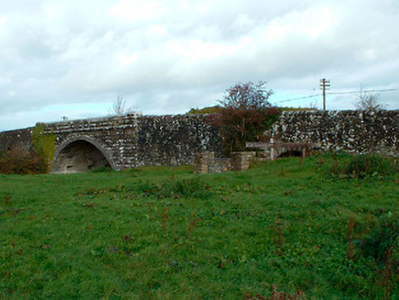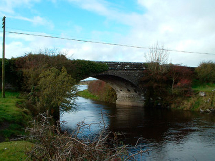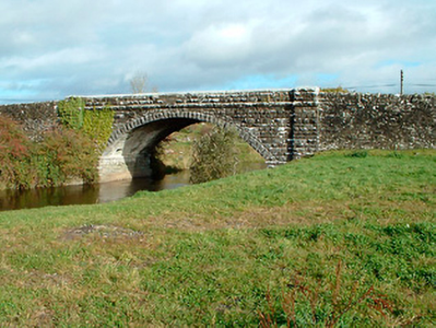 Wide-span single-arched road bridge over River Inny, built c.1857, incorporating the fabric of an earlier bridge to either end (east and west). Constructed using coursed rusticated squared limestone rubble with rusticated rock-faced limestone voussoirs to segmental arch. Rubble limestone construction to earlier sections to east and west. Projecting pulvinated string course at road level and at springing point of arch. Dressed limestone barrel-shaped coping over parapet and terminating piers, on square-plan, to either end of rebuilt section. Rubble limestone construction to earlier sections to east and west having roughly dressed limestone voussoirs. Located to the west of Ballynacarrigy, straddling border with County Longford.