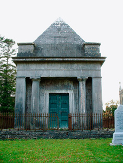 An impressive, if rather austere, mausoleum with important historical connections with the Malone Family of nearby Baronstown House (now demolished). It is robustly detailed in a Greek Revival-style with some intricate stone carvings of high artistic merit, particularly to the coat of arms of the Malone Family on the southwest face. The form of this structure is ultimately derived from the Mausoleum of Halicarnassus (or Tomb of Mausolus), a tomb erected in the fourth century BC in present day Turkey that has provided the model for numerous mausolea and monuments throughout the world. The interior of the mausoleum is on a Greek cross-plan with a central groin vault and barrel-vaulted chambers. One of the ‘arms’ of the Greek cross contains the doorway, and the other three the sarcophagi of Richard Malone (Lord Sunderlin), Antony Malone and Edmond Malone. It was possibly erected to designs by the eminent architect James Wyatt (1746-1813), who was responsible for the designs of the impressive Church of Ireland church adjacent to the east. Indeed, the form of this mausoleum is similar in style to that of the Dawson Mausoleum in County Monaghan, which Wyatt designed between 1770-2. The fine cast-iron railings complete the setting of striking structure, adding to its commanding presence within the grounds of St. Bigseach's Church (15401102).