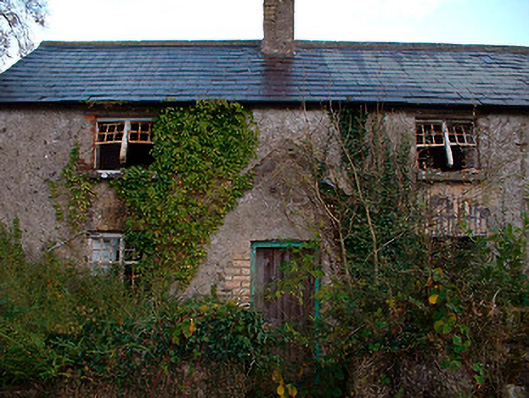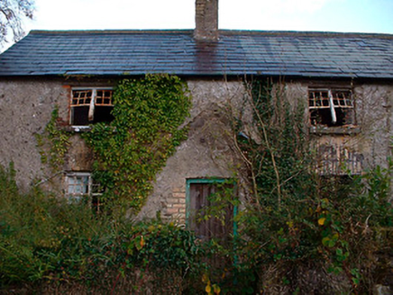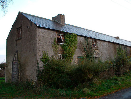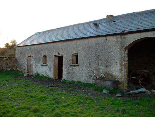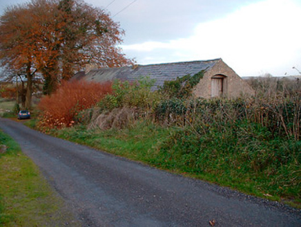 Detached multi-bay two-storey agricultural building with integrated two-bay two-storey dwelling to northeast side, built c.1820. Now out of use and derelict. Pitched natural slate roof with single rendered (brick) chimneystack to northeast end associated with former dwelling house. Constructed of rubble stone with brick dressings to openings and roughcast render over. West-facing elevation (road facing) is blank apart from square-headed window openings to dwelling house with remains of multi-pane metal-framed windows and square-headed doorcase with replacement timber sheeted door at north end to building. Numerous square-headed openings to east-facing façade with full-height segmental-headed carriage arch to centre. Located adjacent to small country road to the southeast of Ballynacarrigy and a south distance south of Balroe Bridge (15401108) and the Royal Canal. Low rubble limestone walls with gate piers on square plan and wrought-iron gates to rear (east).
