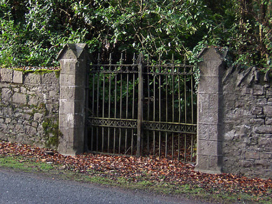 A good quality set of gates and gate piers with an appropriate ecclesiastical character. The unusual stone copping to the piers is of an interesting design and adds to the overall architectural setting of St. Mary's Church. This gateway is set into the estate wall surrounding the former Ballynagall Demesne, forming part of an important collection of related structures.