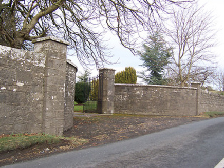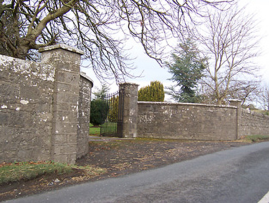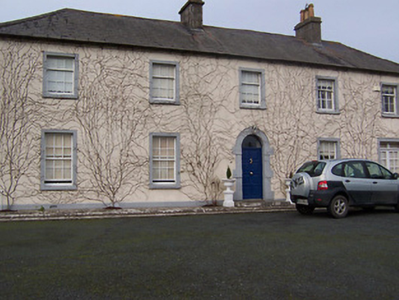 Detached five-bay two-storey house, built c.1830, with modern single-storey extensions to east and west sides. Hipped natural slate roof having two rendered chimneystacks with terracotta chimney pots. Rendered walls over smooth rendered plinth. Square-headed window openings with strip architraves, cut stone sills and six-over-six pane timber sliding sash windows to ground floor openings and three-over-six pane timber sliding sash windows to first floor openings. Central round-headed doorcase with cut stone block-and-start surround, timber panelled door and plain fanlight over. Set back from road in extensive grounds with rubble limestone boundary wall to front (south) and collection of contemporary rubble stone outbuildings to rear (north). Gateways to the southeast and southwest of the house, comprising pairs of roughly dressed limestone gate piers (on square plan) with pyramidal cut stone copping over and iron double-gates.