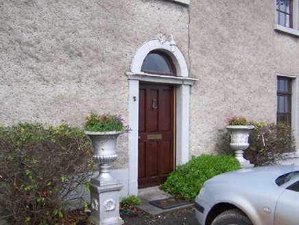 Detached three-bay two-storey house with attic level, built c.1790. Pitched natural slate roof with rendered chimneystacks to either end and modern rooflights. Roughcast rendered walls over smooth rendered plinth with raised block quoins to corners. Square-headed window openings with cut stone sills and replacement timber casement windows. Small square-headed attic window openings to haunches of gables (east and west). Central round-headed doorcase with cut limestone surround with Cavetto cornice to lintel, timber panelled door having plain fanlight over. Set back from road in own grounds with complex of outbuildings to the rear (north). Main entrance gates and boundary wall to south.