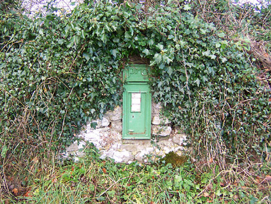 Wall-mounted cast-iron post box, erected c.1940, with raised 'P&T insignia in Gaelic script above letter slot. Set into rubble limestone boundary wall. Located adjacent to cross road junction to northeast of Ballymore.