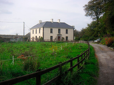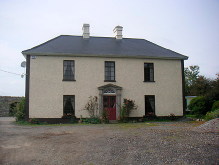 Semi-detached three-bay two-storey house, built c.1780. Hipped artificial slate roof with rendered chimneystacks. Pebbledashed walls over smooth rendered plinth course with smooth rendered margins to corners. Square-headed window openings with replacement timber casement windows. Central round-headed door opening (west) with glazed timber double doors having carved stone doorcase comprising Doric columns supporting an open bed pediment over with spoke fanlight. Set back from road in mature grounds with complex of outbuildings to the south and southwest. Early rubble limestone outbuilding abuts house to rear (west) having pitched slate roof and brick dressings to openings.