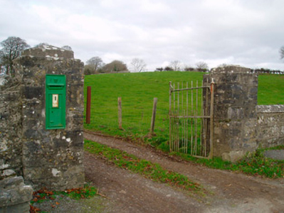 Wall-mounted cast-iron post box, between 1901-10, with raised "ER VII" royal cipher. Makers name appears at base in raised lettering ' T. Allen & Co. London '. Set in rubble limestone gate pier adjacent to road junction and to the northwest of Glassan.