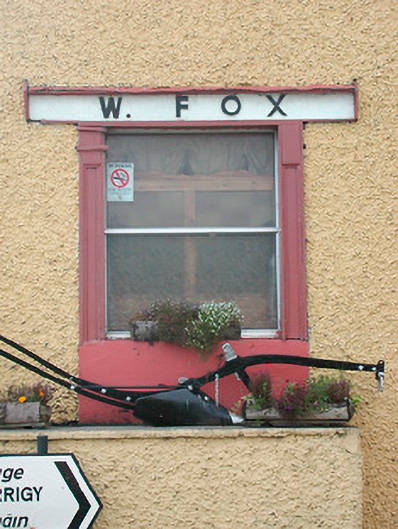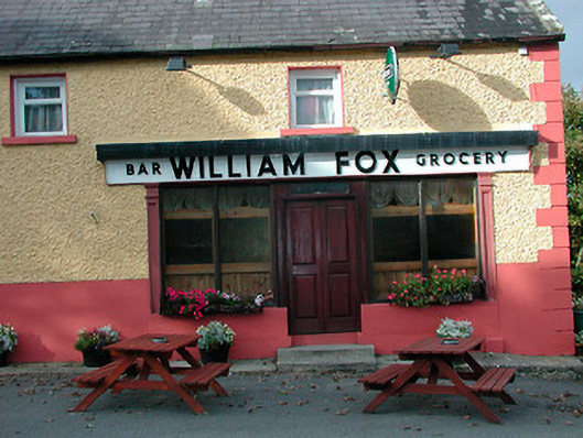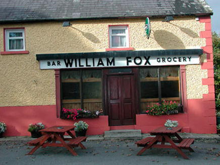 Detached five-bay two-storey house, built c.1840 with pub front inserted to east end, c.1900. single-storey return to rear (northwest). Previously two separate structures but now in single ownership. Pitched natural slate roof with decorative clay ridge tiles and three ruled-and-line rendered chimneystacks having terracotta chimney pots over. Wet dash rendered walls over smooth rendered base with raised quoins to corners. Square-headed window openings, diminished to first floor, with painted reveals and sills. Replacement windows throughout. Single-storey gable-fronted porch to second bay from the west, having slate roof and timber bargeboards over, raised block quoins to the corners and a square-headed doorway with sidelights and glazed timber double doors. Shop/pubfront to east end, added c.1900, having central square-headed doorcase with early timber double doors, flanked to either side by paired fixed pane windows with timber pilasters supporting timber fascia over. Raised lettering to fascia reads ‘BAR WILLIAM FOX GROCERY’. Former doorcase to east gable, now partially blocked and in use as a window, flanked by timber pilasters to either side supporting simple fascia over with raised lettering reading ‘W. FOX’. Wall mounted cast-iron post box (15402517) to east side of rear return. Road-fronted to the east end of Loughanavally.