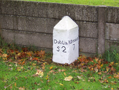 A nicely carved limestone artefact that is an interesting addition to the roadscape to the east of Moate, acting as a subtle reminder of the great age of coaching in Ireland. It probably dates to the late eighteenth-century, a period when the Grand Juries were responsible for a great deal of improvement in the road transport network throughout Ireland. The incised benchmark was carved by the Ordnance Survey in preparation for the production of the first Six-Inch Map Series in the 1830s. This milestone is one of a number surviving along the Dublin Galway Road.