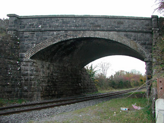 Single-arched railway bridge, built c.1859, carrying road over former Great Southern and Great Western Railway Company’s Portarlington to Athlone railway line. Still in active use. Bridge crosses railway lines at a slightly skewed angle. Constructed of snecked rusticated limestone with an ashlar limestone string course at road level, ashlar limestone coping over parapet walls and brick voussoirs to the arch. Located to the southeast of Athlone.