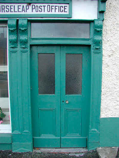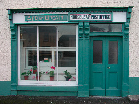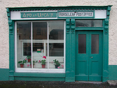 Detached five-bay two-storey house/post office, built c.1830, having a timber shopfront attached to the west end, c.1900. Pitched slate roof with three rendered chimneystacks and uPVC rainwater goods. Wet dash rendered walls over smooth rendered plinth and raised rendered block quoins to the corners. Square-headed window openings with cut stone sills and rendered reveals having one-over-one pane timber sash windows. Square-headed door opening with rendered jambs, plain glass overlight and replacement glazed timber door. Limestone step to road. Square-headed window opening to shopfront having rendered stallriser with three fixed pane windows with timber mullions over. Square-headed door opening to the west side of shopfront having plain glass overlight and original timber double doors. Shopfront to east end comprising pilasters (with inset panels) with console brackets over supporting timber fascia having moulded timber cornice over with dentil blocks. Simple script to fascia reading ‘’HORSELEAP POST OFFICE’. Road fronted to the south of the main Dublin to Galway road.