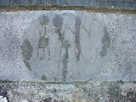 Single-arch canal bridge spanning dried-up section of the Grand Canal (Kilbeggan Branch), built c.1831, with curved flanking walls to either end (east and west). Constructed of ashlar limestone with ashlar limestone voussoirs to arch and a projecting ashlar limestone string course at road level. Cut stone plaque to the north parapet reads ‘Mann Bridge 1831’. Towpath to the east bank. Located to the southeast of Kilbeggan.