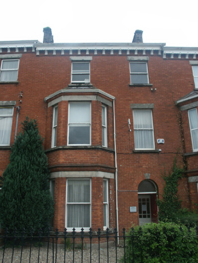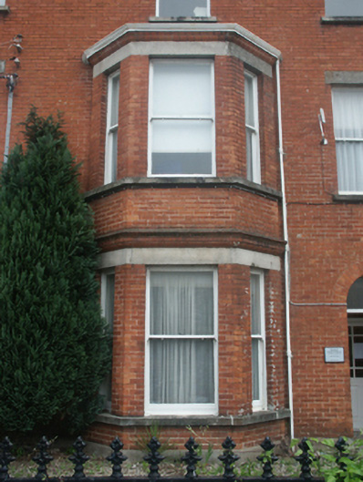 Terraced two-bay three-storey townhouse, built 1892, on a rectangular plan. Occupied, 1901; 1911. One of a terrace of eight. Pitched slate roof with clay ridge tiles, coping to gables with red brick Running bond chimney stacks to apexes having corbelled stepped capping supporting yellow terracotta pots, and cast-iron rainwater goods on decorative timber eaves boards on timber consoles on terracotta stringcourse. Red brick Running bond wall to front (south) elevation on rendered chamfered plinth; rendered surface finish (remainder). Round-headed door opening (east) with cut-granite step threshold, and red brick voussoirs centred on cut-granite keystone framing timber panelled door having overlight. Square-headed window openings with cut-granite sills, and cut-granite lintels framing one-over-one timber sash windows. Set back from line of street with cast-iron colonette piers to perimeter having polygonal capping supporting crocketed cast-iron gate.