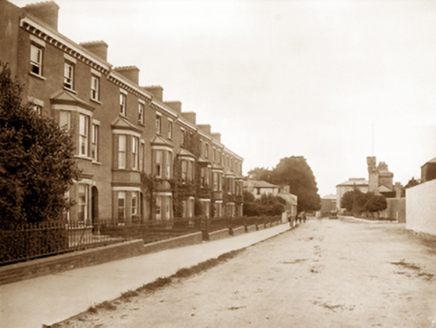 Terraced two-bay three-storey townhouse, built 1892, on a rectangular plan. Occupied, 1901; 1911. Refenestrated, ----. One of a terrace of eight. Pitched slate roof with clay ridge tiles, coping to gables with red brick Running bond chimney stacks to apexes having corbelled stepped capping supporting yellow terracotta pots, and cast-iron rainwater goods on decorative timber eaves boards on timber consoles on terracotta stringcourse. Red brick Running bond wall to front (south) elevation on rendered chamfered plinth; rendered surface finish (remainder). Round-headed door opening (east) with cut-granite threshold, and red brick voussoirs centred on cut-granite keystone framing timber panelled door having overlight. Square-headed window openings with cut-granite sills, and cut-granite lintels framing replacement uPVC casement windows replacing one-over-one timber sash windows. Set back from line of street with cast-iron colonette piers to perimeter having polygonal capping supporting crocketed cast-iron gate.