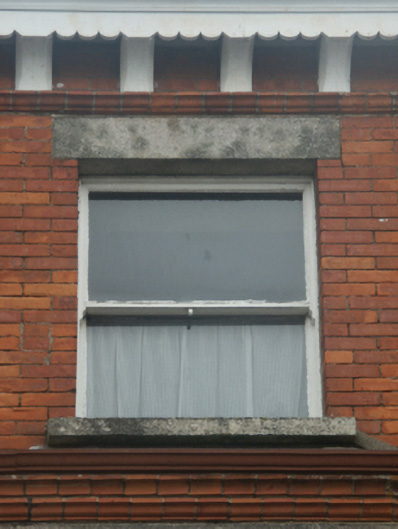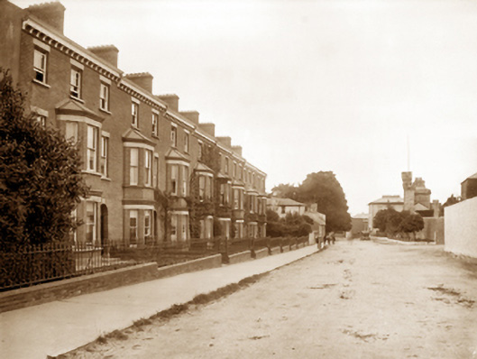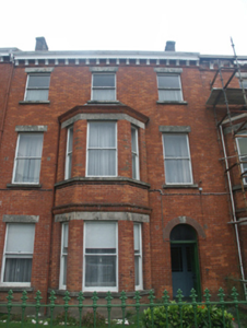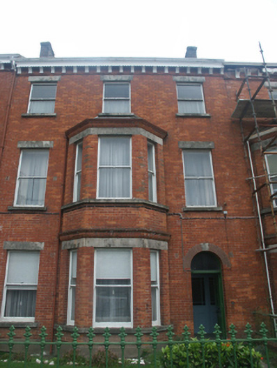 Terraced three-bay three-storey townhouse, built 1892, on a rectangular plan. Occupied, 1901; 1911. Undergoing restoration, 2006. One of a terrace of eight. Pitched slate roof with clay ridge tiles, coping to gables with red brick Running bond chimney stacks to apexes having corbelled stepped capping supporting yellow terracotta pots, and cast-iron rainwater goods on decorative timber eaves boards on timber consoles on terracotta stringcourse. Red brick Running bond wall to front (south) elevation on rendered chamfered plinth; rendered surface finish (remainder). Round-headed door opening (east) with threshold supporting cast-iron bootscrapers, and red brick voussoirs centred on cut-granite keystone framing timber panelled door having overlight. Square-headed window openings with cut-granite sills, and cut-granite lintels framing one-over-one timber sash windows. Set back from line of street with cast-iron colonette piers to perimeter having polygonal capping supporting crocketed cast-iron gate.