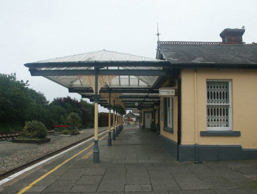 Detached seven-bay single-storey railway station, built 1890-1, on a H-shaped plan with single-bay (two-bay deep) single-storey gabled advanced end bays; seven-bay single-storey platform (north) elevation with single-bay single-storey gabled projecting end bays. Pitched slate roof on a H-shaped plan abutting hipped glazed roof (north) in timber frame on cast-iron Corinthian colonette pillars, trefoil-perforated crested terracotta ridge tiles, red brick Running bond chimney stacks on chamfered cushion courses on red brick Running bond bases having corbelled stepped chamfered capping supporting iron-covered pots, decorative timber bargeboards to gables on timber purlins with wrought iron finials to apexes, and cast-iron rainwater goods on timber eaves boards retaining cast-iron square profile downpipes. Rendered, ruled and lined walls on moulded cushion course on rendered plinth. Square-headed central door opening with tiled step threshold, and moulded surround framing replacement fittings. Square-headed flanking window openings with cut-granite chamfered sills, and moulded surrounds framing one-over-one timber sash windows. Square-headed window openings in bipartite arrangement (end bays) with cut-granite chamfered sills, fluted timber mullions, and moulded surrounds centred on diamond pointed rusticated keystones framing one-over-one timber sash windows. Square-headed central door opening to platform (north) elevation with tiled step threshold, and moulded surround framing replacement fittings. Square-headed flanking window openings with cut-granite chamfered sills, and moulded surrounds framing one-over-one timber sash windows. Square-headed window openings in bipartite arrangement (end bays) with cut-granite chamfered sills, fluted timber mullions, and moulded surrounds centred on diamond pointed rusticated keystones framing one-over-one timber sash windows. Square fronted with tarmacadam footpath to front.