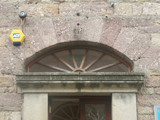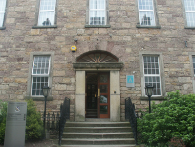 County Gaol complex including: Detached five-bay (single-bay deep) three-storey over basement gaol block, built 1843-6, on a T-shaped plan; single-bay (three-bay deep) full-height central return (south) with six-bay three-storey wings. In alternative use, 1908-18. Reconstructed, 1929-30, with interior remodelled to accommodate alternative use. Renovated, 1993. Hipped slate roof with clay ridge tiles, cut-granite coping to gable (south) with granite ashlar chimney stack to apex on cut-granite cushion course on rendered base having cut-granite stringcourse below capping, and cast-iron rainwater goods on cut-granite eaves retaining cast-iron downpipes. Part repointed coursed rubble "Old Red Sandstone" walls with cut-granite flush quoins to corners. Segmental-headed central door opening approached by flight of five cut-granite steps between cast-iron railings, cut-granite doorcase with monolithic pilasters supporting ogee cornice, and "Old Red Sandstone" ashlar voussoirs framing replacement glazed timber double doors having fanlight. Square-headed window openings with cut-granite sills, and cut-granite monolithic surrounds framing replacement uPVC casement windows replacing six-over-six timber sash windows. Interior including (ground floor): central vestibule; segmental-headed door opening into hall with replacement glazed timber double doors having fanlight; triple-height staircase hall (south) retaining moulded surrounds to door openings framing timber panelled doors, staircase on an Imperial plan with cast-iron balusters supporting carved timber banisters terminating in volutes, rosette-detailed moulded surrounds to door openings to landings framing timber panelled double doors, and plasterwork cornice to geometric ceiling; (first floor); square-headed door opening into courtroom with carved timber surround framing glazed timber panelled double doors: double-height courtroom retaining public gallery (south) with cast-iron railing, timber panelled benches centred on timber panelled judge's bench, and geometric ceiling with wrought iron chandeliers. Set in shared grounds.