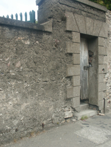 Gateway, extant 1840, with rusticated rendered block-and-start surround framing timber boarded door. Street fronted at entrance to grounds of Wexford County Infirmary.