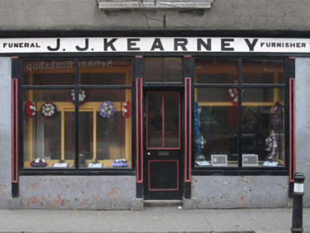 End-of-terrace single-bay (three-bay deep) three-storey house, extant 1840, on a rectangular plan with shopfront to ground floor; two-bay three-storey rear (east) elevation. Refenestrated, ----. Hipped and pitched slate roof with clay ridge tiles, rendered chimney stack (west) having stringcourse below capping supporting terracotta or yellow terracotta pots, and replacement uPVC rainwater goods on rendered eaves. Rendered, ruled and lined walls. Timber shopfront to ground floor on a symmetrical plan centred on glazed timber panelled door having overlight. Square-headed window openings originally in tripartite arrangement (upper floors) with cut-granite sills, and concealed dressings framing replacement uPVC casement windows replacing six-over-six timber sash windows having two-over-two sidelights. Street fronted on a corner site with concrete footpath to front.