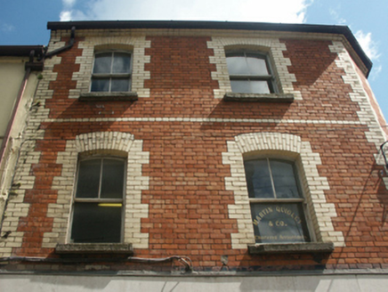 Terraced three-bay three-storey office building, extant 1941, on a rectangular plan including single-bay three-storey (west) or two-bay three-storey (north) elevations. Renovated, 1988, with replacement shopfront inserted to ground floor. Now disused. Pitched and hipped slate roof with clay ridge tiles, red brick Running bond chimney stack (south) having corbelled stepped stringcourse below capping supporting terracotta pots, and replacement uPVC goods on yellow brick header bond stepped eaves. Red brick Flemish bond walls (upper floors) with yellow brick quoins to corners. Camber- or segmental-headed window openings (upper floors) with cut-granite sills, and yellow brick block-and-start surrounds framing two-over-two timber sash windows. Interior including (first floor): office retaining timber boarded ceiling on timber "Cavetto" cornice. Street fronted on a corner site with concrete footpath to front.