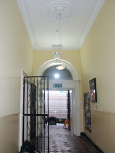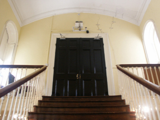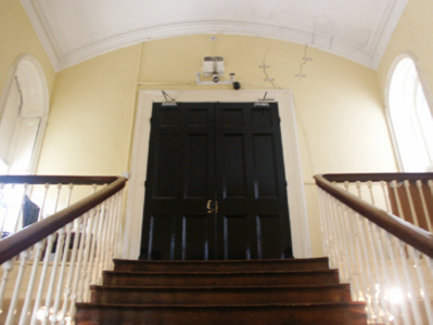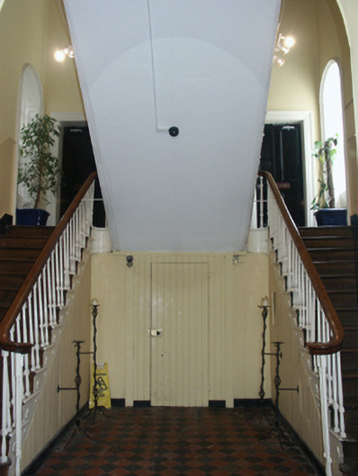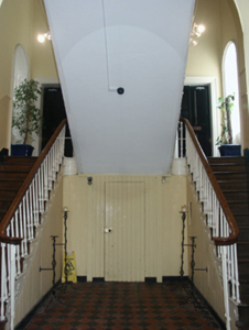 Attached five-bay two-storey hall, designed 1861; built 1862-4, on a cruciform plan centred on three-bay two-storey "bas-relief" breakfront; single-bay (two-bay deep) full-height central return (west). Sold, 2000. Modified, 2002-3, to accommodate alternative use. Pitched slate roof on a T-shaped plan centred on pitched slate roof (west), clay ridge tiles, and replacement uPVC rainwater goods on slightly overhanging granite flagged eaves. Part repointed tuck pointed red brick Flemish bond wall to front (east) elevation on rendered chamfered plinth with red brick Flemish bond "bas-relief" band to eaves; rendered, ruled and lined surface finish (remainder). Square-headed central door opening with cut-granite step threshold, cut-granite doorcase with engaged columns on plinths supporting pediment on blind frieze on entablature framing timber panelled double doors having overlight. Square-headed window openings with benchmark-inscribed cut-granite sills, and red brick voussoirs framing two-over-two timber sash windows. Interior including (ground floor): central vestibule retaining tessellated "quarry tile" floor, and plasterwork cornice to ceiling; segmental-headed door opening into hall with carved timber Classical-style surround framing glazed timber panelled double doors having overlight; hall retaining tessellated "quarry tile" floor, carved timber surrounds to door openings framing timber panelled doors, moulded plasterwork cornice to ceiling centred on "Acanthus"-detailed ceiling rose in decorative plasterwork frame, timber boarded staircase on an Imperial plan with cast-iron "spindle" balusters supporting carved timber banisters terminating in volutes, carved timber surrounds to window openings to half-landing framing timber panelled shutters on panelled risers with carved timber surrounds to door openings framing timber panelled doors, carved timber surrounds to window openings to landing framing timber panelled shutters on panelled risers with carved timber surround to door opening framing timber panelled double doors, and moulded plasterwork cornice to segmental vaulted ceiling; room (south) retaining carved timber surround to door opening framing timber panelled door with carved timber surround to window opening framing timber panelled shutters on panelled risers, and plasterwork cornice to ceiling; room (north) retaining carved timber surround to door opening framing timber panelled door with carved timber surrounds to window openings framing timber panelled shutters on panelled risers, and plasterwork cornice to ceiling; and (first floor): concert hall retaining carved timber surrounds to window openings framing timber panelled shutters on panelled risers, and egg-and-dart-detailed decorative plasterwork cornice to ceiling centred on "Acanthus"-detailed ceiling roses in decorative plasterwork frames. Street fronted.