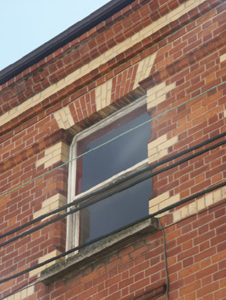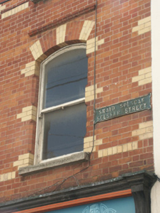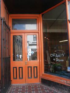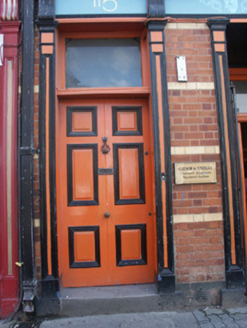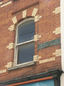 Terraced three-bay three-storey red brick house with dormer attic, built 1907, with shopfront to ground floor. Now in use as offices to upper floors. One of a pair. Pitched (shared) slate roof with clay ridge tiles, red brick Flemish or Running bond chimney stack having yellow brick stringcourses, stepped capping supporting terracotta or yellow terracotta pots, coping to gable, and cast-iron rainwater goods on moulded red brick eaves having iron ties retaining cast-iron square-profiled downpipe. Red brick Flemish bond wall to front (east) elevation with yellow brick dressings including quoins to ends, stringcourses to each floor, moulded red brick stringcourse to top floor, red brick stringcourse supporting yellow brick Flemish bond frieze, moulded red brick cornice, and rendered, ruled and lined walls to remainder. Camber-headed window openings to first floor with square-headed window openings to top floor having cut-granite sills, yellow brick 'quoined' chamfered surrounds rising into red and yellow brick voussoirs (red brick hood mouldings over to first floor; moulded red brick stringcourse to top floor), and one-over-one timber sash windows. Timber shopfront to ground floor with panelled (hollow) pilasters on cut-stone padstones, fixed-pane (two-light) display windows on vitrified blue brick riser incorporating spandrels, iron gate leading over decorative clay-tiled threshold to glazed timber panelled double doors having overlight incorporating spandrels, timber panelled door to house on cut-granite step having overlight incorporating spandrels, fascia having fluted consoles, and moulded cornice. Interior with diagonal tongue-and-groove timber panelled ceiling to ground floor in carved timber 'compartmentalised' frame. Street fronted with concrete brick cobbled footpath to front [VO].