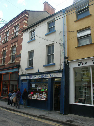 Terraced two-bay three-storey house, c.1875, possibly incorporating fabric of earlier range, pre-1840, on site. Renovated, c.1975, with replacement 'shopfront' inserted to ground floor. Pitched slate roof with clay ridge tiles, rendered (shared) chimney stack, and cast-iron rainwater goods on rendered eaves having iron ties. Rendered walls. Square-headed window openings with cut-stone sills, and two-over-two timber sash windows. Replacement 'shopfront', c.1975, to ground floor on a symmetrical plan with fixed-pane timber display window having casement overlights, glazed timber door having overlight, tongue-and-groove timber panelled door to house having overlight, and fascia having moulded cornice. Street fronted with concrete brick cobbled footpath to front.