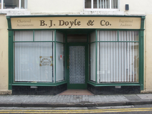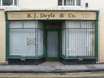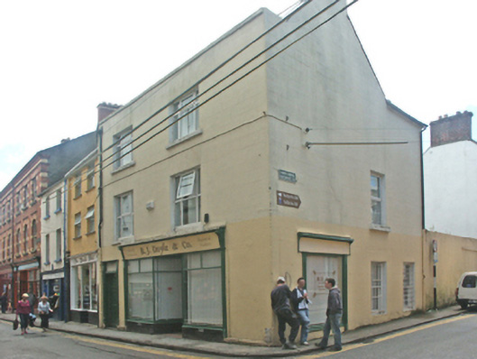 End-of-terrace two-bay three-storey house, extant 1840, on an L-shaped plan plan with shopfront to ground floor; pair of single-bay three-storey returns (west). Renovated, ----, to accommodate continued alternative use. Replacement pitched artificial slate roof behind parapet; pitched slate roofs (west), ridge tiles, rendered chimney stacks having stepped capping supporting terracotta pots, and concealed rainwater goods retaining cast-iron hopper and downpipe with cast-iron rainwater goods to rear (west) elevation on rendered eaves retaining cast-iron downpipes. Rendered, ruled and lined walls on rendered chamfered plinth with coping to parapet. Timber shopfront to ground floor on a symmetrical plan centred on glazed timber door having overlight. Square-headed window openings originally in tripartite arrangement (upper floors) with sills, and concealed dressings framing replacement uPVC casement windows replacing one-over-one timber sash windows having one-over-one sidelights. Interior including staircase with turned timber balusters supporting carved timber banister terminating in turned timber newels; and (upper floors): carved timber surrounds to door openings framing timber panelled doors. Street fronted on a corner site with concrete footpath to front.